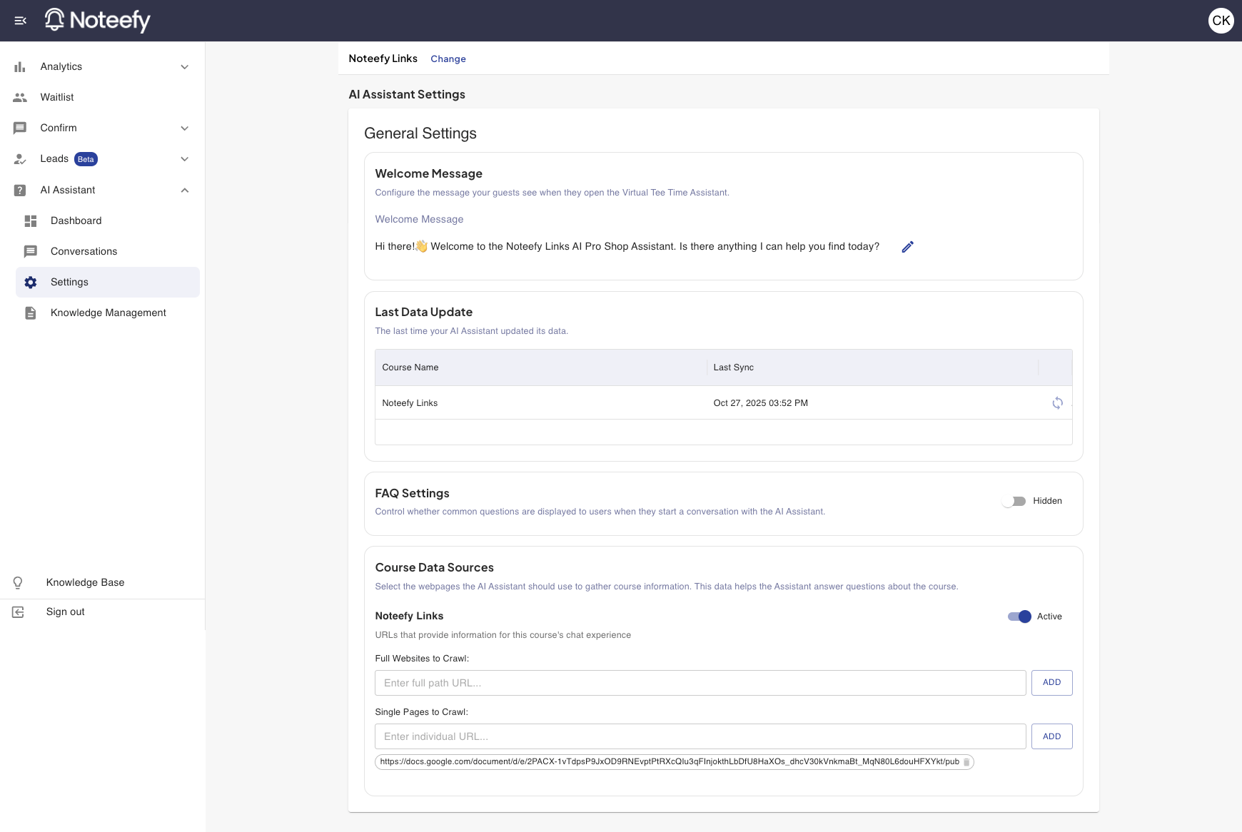 Use the General Settings tab to control your Virtual Tee Time Assistant’s welcome message, data sources, FAQ settings, and website syncing. This ensures the Assistant can respond with accurate, course-specific answers for your players.