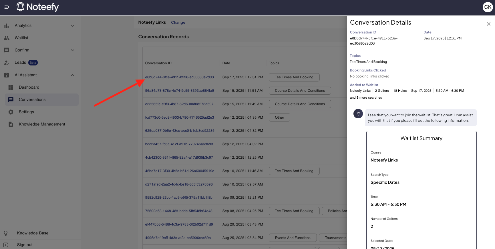 - If a customer starts the waitlist search flow through their conversation, you will be able to see the search that they create
