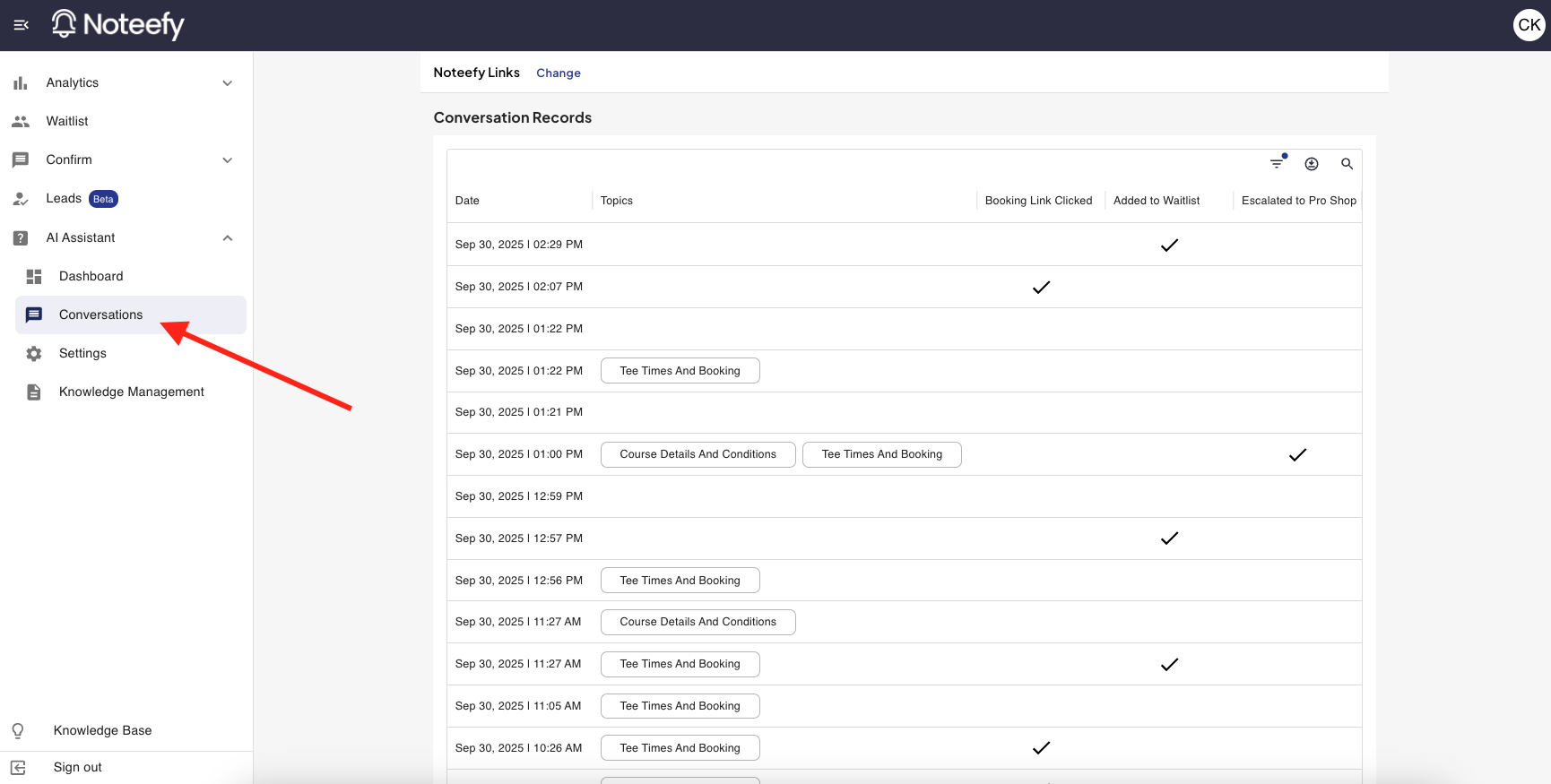 - If the AI Assistant suggested reaching out to the pro shop in its response because it did not have the information to answer, you will see a checkbox in the ‘Escalated to Pro Shop’ column
