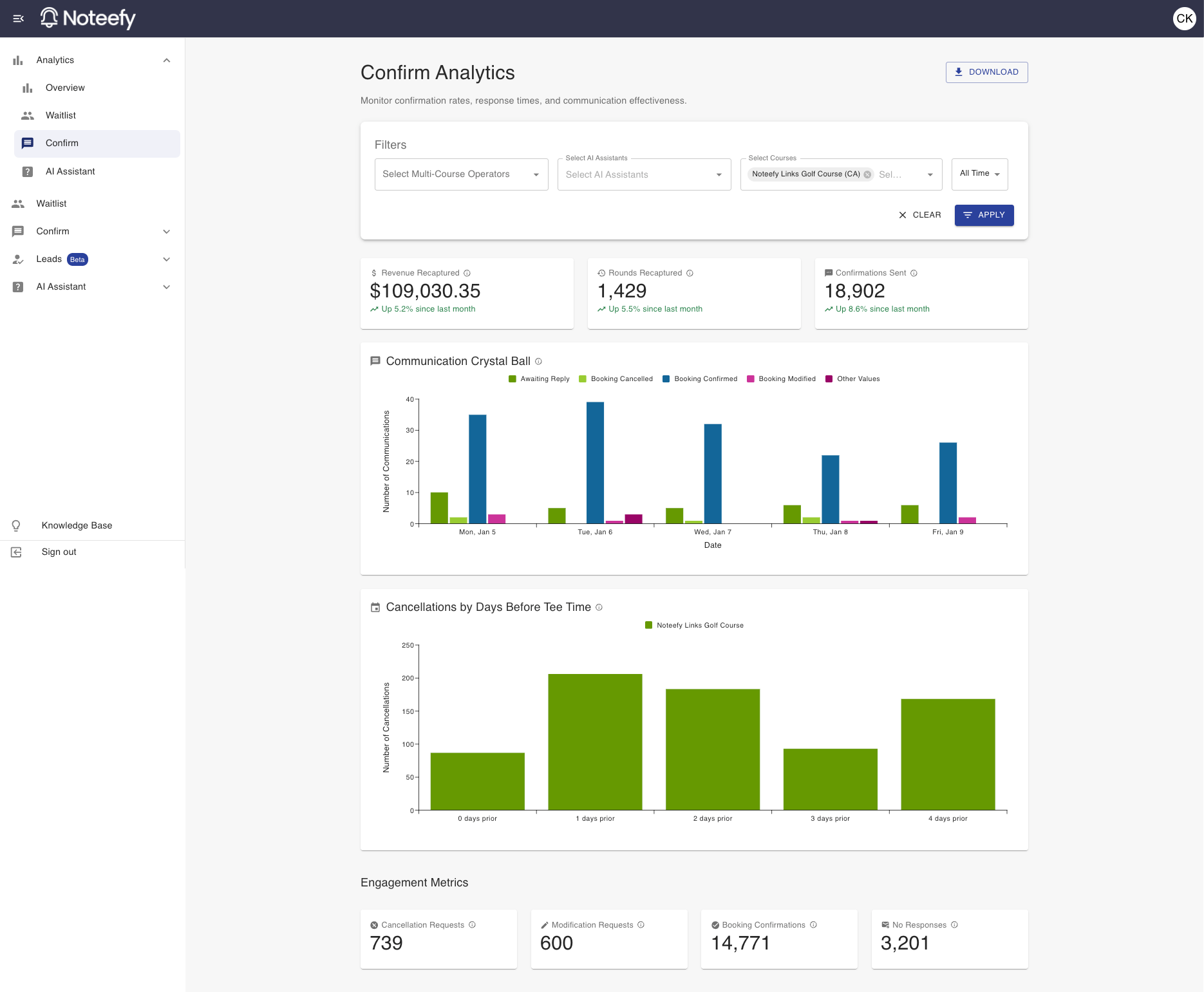 Noteefy’s Confirm Analytics gives you visibility into how your course is performing with Noteefy’s Confirm product. Use this data to make smarter decisions, optimize operations, and elevate the golfer experience.