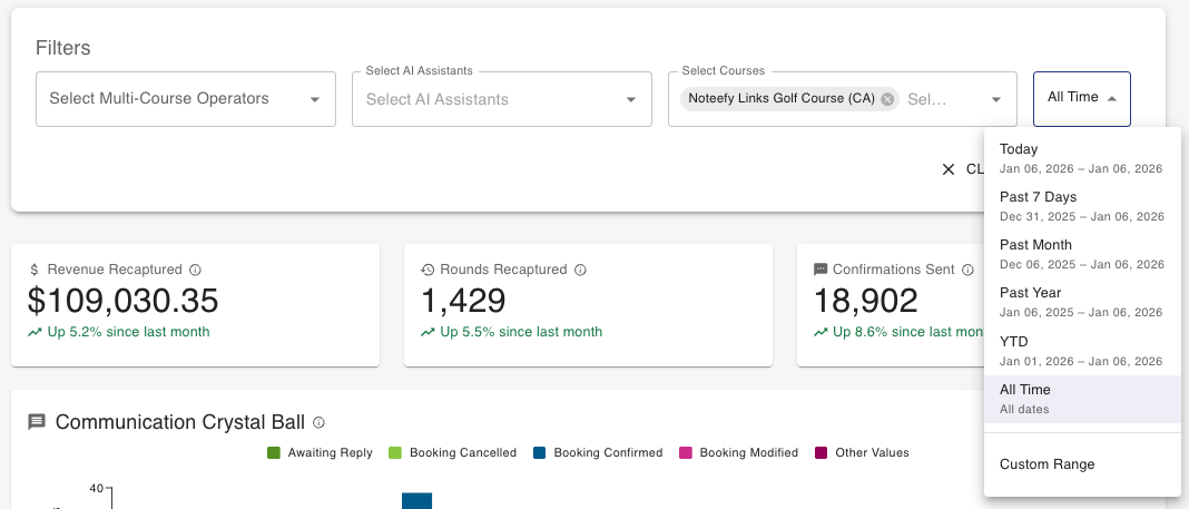 - Rounds Recaptured: Total number of cancelled golf rounds that were successfully refilled through confirmation communications.