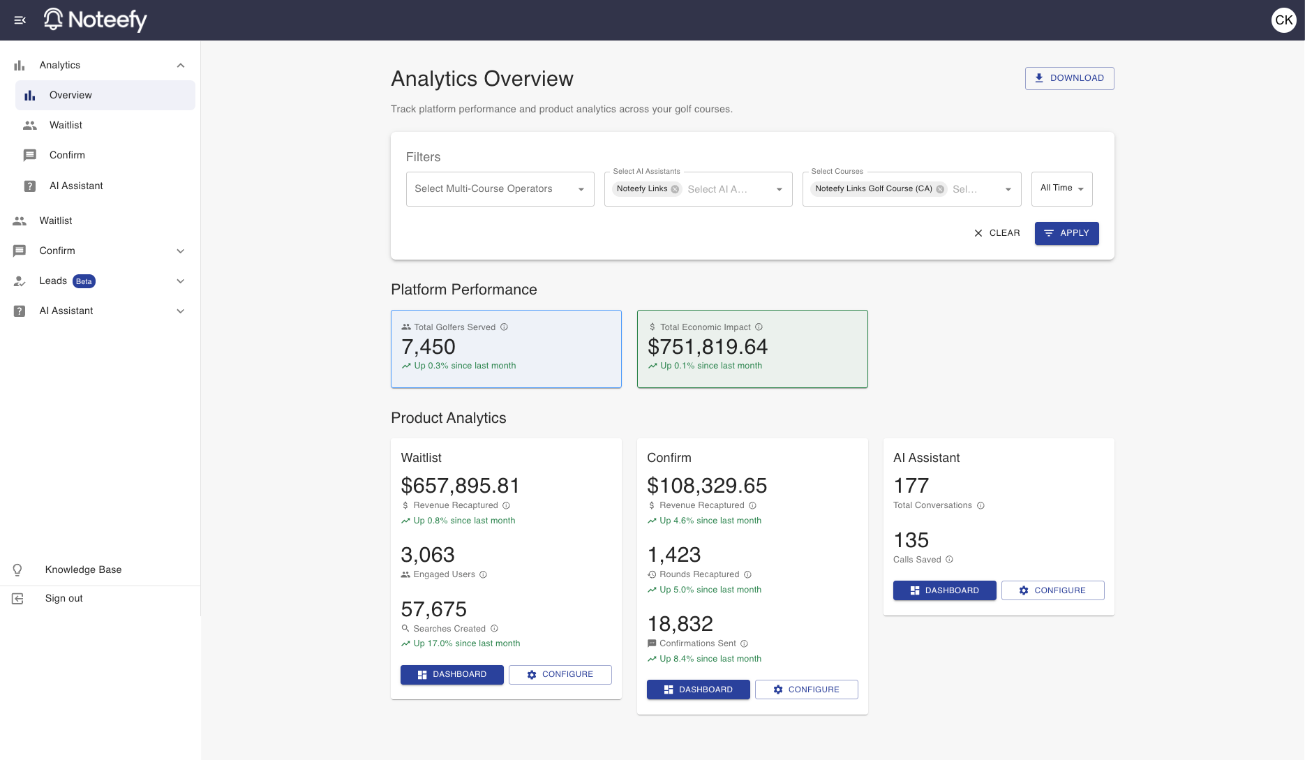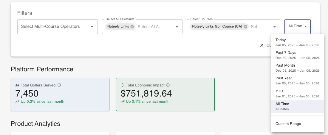 Noteefy’s Platform Analytics Overview gives you visibility into how your course is performing across the full suite of Noteefy products. Use this data to make smarter decisions, optimize operations, and elevate the golfer experience.