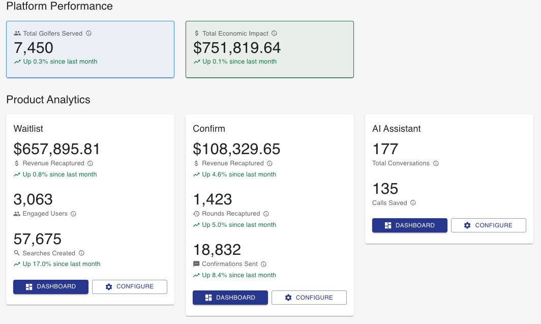 - Rounds Recaptured: Total number of cancelled golf rounds that were successfully refilled through confirmation communications.