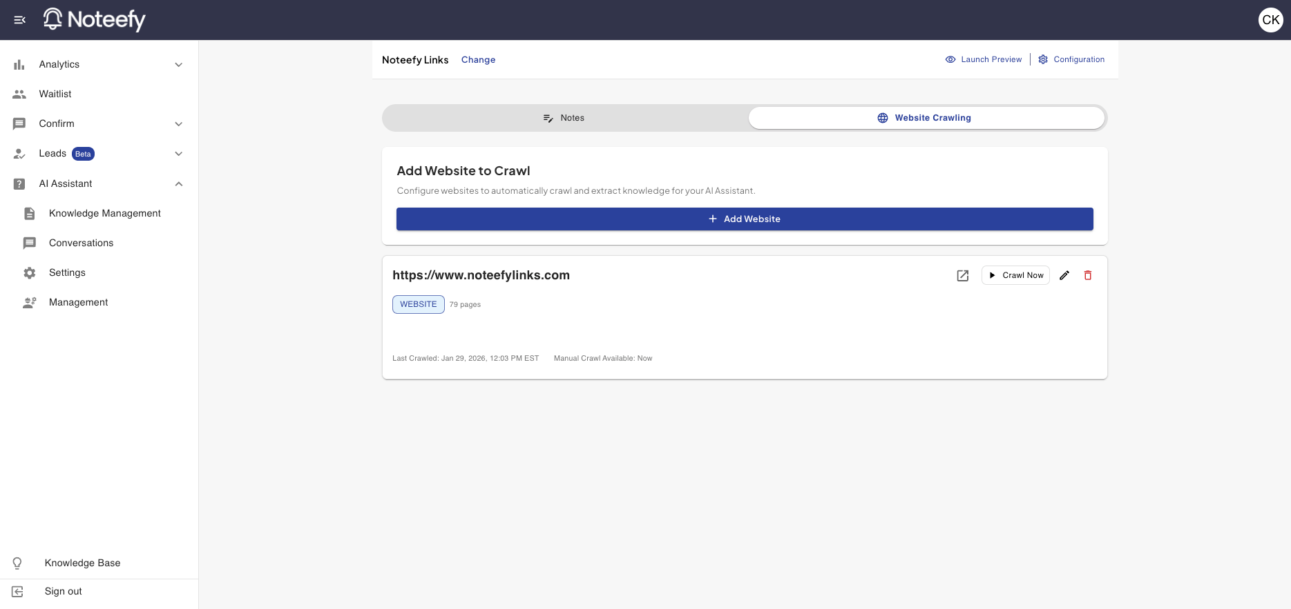 To start, the Noteefy team will create an initial version of your AI Assistant that sources information from your main website. This may end up being everything you need, but you may also want to add other website(s) or edit what was initial set and this will be the spot to do it.