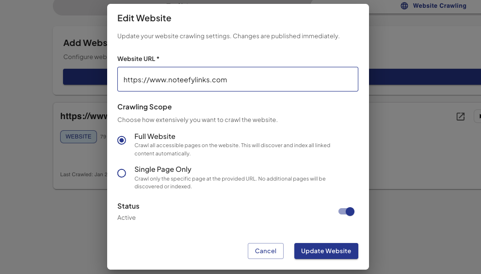 You may be asking yourself what exactly website crawling is. Website crawling is when a computer program automatically visits websites and looks through their pages, kind of like a very fast reader flipping through a book. It follows links from one page to another to see what information is available. In Noteefy’s context, we use crawling to discover new pages and keep the source of your AI Assistant’s context as up to date as possible.